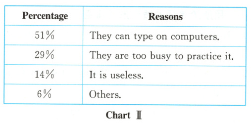 So, should we spend time in practicing writing? Some people say that with computers we can write without a pen. Some people say that practicing writing is a traditional culture of the Chinese nation, and that it should be carried forward. According to a recent survey in a middle school, more than half of the students have poor handwriting.