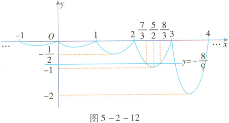 解 当$-1<x\leqslant0$时,$0<x+1\leqslant1$,则$f(x)=\frac{1}{2}f(x+1)=\frac{1}{2}(x+1)x$;当$1<x\leqslant2$时,$0<x-1\leqslant1$,则$f(x)=2f(x-1)=2(x-1)(x-2)$;当$2<x\leqslant3$时,$0<x-2\leqslant1$,则$f(x)=2f(x-1)=2^2f(x-2)=2^2(x-2)(x-3)$;…。由此可得$f(x)=\begin{cases}·s\frac{1}{2}(x+1)x,-1<x\leqslant0,\\x(x-1),0<x\leqslant1,\\2(x-1)(x-2),1<x\leqslant2,\\2^2(x-2)(x-3),2<x\leqslant3,\\·s\end{cases}$作出函数$f(x)$的图像并画出直线$y=-\frac{8}{9}$,如图5-2-12所示。