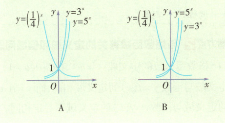 函数 $y = 3^x, y = 5^x, y = \left(\frac{1}{4}\right)^x$ 在同一平面直角坐标系中的图像是()。