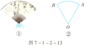 2.(2024·江苏连云港高一月考·能力点2)(多选)小夏同学在学习了《任意角和弧度制》后,对家里的扇形瓷器盘(图7-1-2-13①)产生了浓厚的兴趣,并临摹出该瓷器盘的大致形状(图7-1-2-13②)。在扇形$ OAB $中,$\angle AOB=\frac{\pi}{3}$,$ OB=OA=2 $,则()。