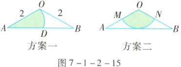 5.(能力点2)在一块顶角为$\frac{2\pi}{3}$、腰长为2的等腰三角形钢板废料$ OAB $中裁剪扇形,现有如图7-1-2-15所示的两种方案。