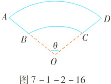 6.(2024·山东省实验中学期中·能力点2)某企业欲做一个介绍企业发展史的铭牌,铭牌的截面是如图7-1-2-16所示的扇形环面(由扇形$ OAD $挖去扇形$ OBC $后构成)。已知$ OA=10 $,$ OB=x(0<x<10) $,线段$ BA,CD $与$\overset{\frown}{BC},\overset{\frown}{AD}$的长度之和为30,圆心角为$\theta\ rad$。