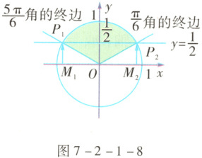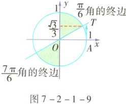 解 如图7-2-1-11, 画出三角函数线 $\sin \alpha = MP, \cos \alpha = OM$, 由于 $\sin \left(-\frac{3\pi}{4}\right) = \cos \left(-\frac{3\pi}{4}\right)$, $\sin \frac{\pi}{4} = \cos \frac{\pi}{4}$, 为使 $\sin x \leq \cos x$ 成立, 由图可得在 $[-\pi, \pi]$ 内, $-\frac{3\pi}{4} \leq x \leq \frac{\pi}{4}$。故填①。