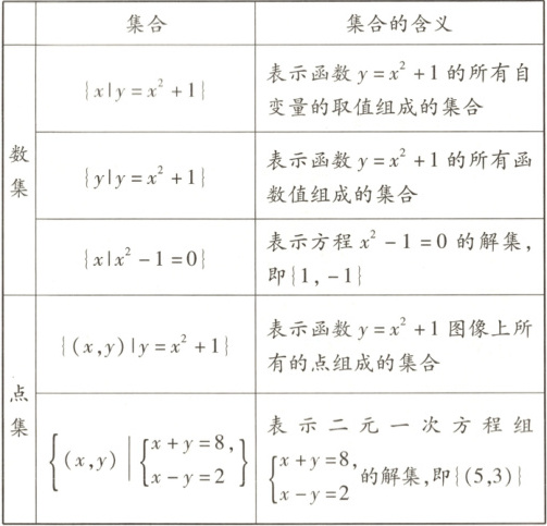 解 ①中二元方程的解集应为点集$\left\{\left(\frac{1}{2},-1\right)\right\}$,而$\left\{\frac{1}{2},-1\right\}$是数集,故①不正确;②中方程为一元二次方程,其解集应为数集$\{-2,3\}$,而$\{(-2,3)\}$是点集,故②不正确;③中$A$为二次函数$y=2x^2-1$的所有函数值组成的集合,是数集,而$B$是二次函数$y=2x^2-1$的图像上所有的点组成的集合,是点集,$C$表示以等式$y=2x^2-1$为元素的集合,是式集,所以$A,B,C$表示的不是同一个集合,故③不正确。因此,正确说法的个数为0。