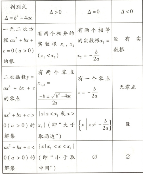 由上表可以看出 $ax^2 + bx + c > 0 (a \neq 0)$ 对一切 $x \in \mathbf{R}$ 都成立的条件为 $\begin{cases} a > 0, \\ \Delta < 0, \end{cases}$ $(a \neq 0)$ 对一切 $x \in \mathbf{R}$ 都成立的条件为 $\begin{cases} a < 0, \\ \Delta < 0. \end{cases}$