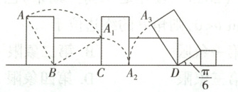 9. $\frac{9 + 2\sqrt{3}}{6}\pi dm$ 解析:如图,第一次是以 B 为旋转中心,以$BA = \sqrt{(\sqrt{3})^2 + 1} = 2$为半径旋转$90°$,此次点 A 走过的路径是$\frac{\pi}{2} × 2 = \pi$,第二次是以 C 为旋转中心,以$CA_1 = 1$为半径旋转$90°$,此次点 A 走过的路径是$\frac{\pi}{2} × 1 = \frac{\pi}{2}$,第三次是以 D 为旋转中心,以$DA_2 = \sqrt{3}$为半径旋转$60°$,此次点 A 走过的路径是$\frac{\pi}{3} × \sqrt{3} = \frac{\sqrt{3}\pi}{3}$,$\therefore$点 A 三次共走过的路径是$\pi + \frac{\pi}{2} + \frac{\sqrt{3}\pi}{3} = \frac{9 + 2\sqrt{3}}{6}\pi (dm)$.故答案为$\frac{9 + 2\sqrt{3}}{6}\pi dm$.
