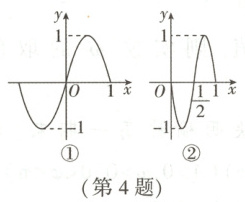 4.D 解析:由题图①可知,$T=2$,所以$\omega=\frac{2\pi}{T}=\pi$,所以$f(x)=\sin\pi x$,题图②可看成由题图①向右平移1个单位长度,得$f(x-1)$,再将所有点的横坐标变为原来的一半,纵坐标不变,得$f(2x-1)$.故选D.