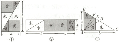 7. * 《九章算术》中有“勾股容方”问题:“今有勾五步,股十二步。问:勾中容方几何?”魏晋时期数学家刘徽在《九章算术注》中利用出入相补原理给出了这个问题的一般解法:如图①,用对角线将长和宽分别为$b$和$a$的矩形分成两个直角三角形,每个直角三角形再分成一个内接正方形(黄)和两个小直角三角形(朱、青)。将三种颜色的图形进行重组,得到如图②所示的矩形,该矩形长为$a + b$,宽为内接正方形的边长$d$。由刘徽构造的图形可以得到许多重要的结论,如图③,设$D$为斜边$BC$的中点,作直角三角形$ABC$的内接正方形对角线$AE$,过点$A$作$AF\perp BC$于点$F$,则下列推理正确的是(