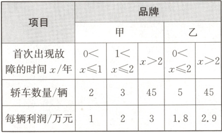 受轿车在保修期内维修费等因素的影响,企业生产每辆轿车的利润与该轿车首次出现故障的时间有关. 某轿车制造厂生产甲、乙两种品牌轿车,保修期均为 $ 2 $ 年,现从该厂已售出的两种品牌轿车中各随机抽取 $ 50 $ 辆,统计数据如下:
