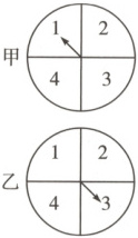 5. 已知两个转盘如图所示,同时转动这两个转盘,记转盘甲得到的数为 $ x $,转盘乙得到的数为 $ y $(若指针停在边界上则重新转),$ x $,$ y $ 构成数对 $ (x, y) $,则所有数对 $ (x, y) $ 中,满足 $ xy = 4 $ 的概率为(