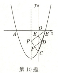 10. 如图,抛物线 $ y = x^2 + 2x - 3 $ 与 $ x $ 轴交于 $ A $,$ B $ 两点,与 $ y $ 轴交于点 $ C $,$ P $ 是抛物线对称轴上任意一点。若 $ D $,$ E $,$ F $ 分别是 $ BC $,$ BP $,$ PC $ 的中点,连接 $ DE $,$ DF $,则 $ DE + DF $ 的最小值为