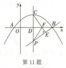 11. 如图,抛物线 $ y = -\frac{2}{9}x^2 + bx + c $ 与 $ x $ 轴交于 $ A(-1,0) $,$ B(5,0) $ 两点,顶点为 $ C $,其对称轴交 $ x $ 轴于点 $ D $,$ P $ 为抛物线的对称轴 $ CD $ 上的一动点(点 $ P $ 不与点 $ C $,$ D $ 重合)。过点 $ C $ 作直线 $ PB $ 的垂线,交 $ PB $ 于点 $ E $,交 $ x $ 轴于点 $ F $(提示:互相垂直的两条直线对应的解析式中的 $ k $ 之积为 $ -1 $)。