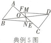 典例 5 如图,AC 与 BD 交于点 O,连接 AB,CD, $AB = CD$, $AB // CD$,点 E,F 在线段 AC 上,且 $AF = CE$,M 是 DF 上的动点,连接 MO 并延长,交 BE 于点 N. 请运用中心对称的性质,求证: $MO = NO$.