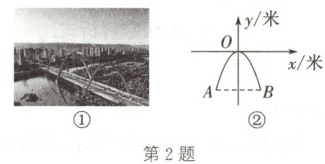 2. 如图①,北中环桥是太原的一座跨汾河大桥,它由五个高度不同、跨径也不同的抛物线形钢拱通过吊桥、拉索与主梁相连,最高的钢拱如图②所示,此钢拱(近似看成抛物线)在同一竖直平面内,与拱脚所在的水平面相交于 $ A $,$ B $ 两点,拱高为 $ 78 $ 米(即最高点 $ O $ 到 $ AB $ 的距离为 $ 78 $ 米),跨径为 $ 90 $ 米(即 $ AB = 90 $ 米),以最高处 $ O $ 为坐标原点,以平行于 $ AB $ 的直线为 $ x $ 轴建立平面直角坐标系,则此抛物线形钢拱对应的解析式为(