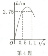 4. 某足球运动员将足球沿与地面成一定角度的方向踢出,若不考虑空气阻力,足球飞行的高度 $ h(m) $ 与足球飞行的时间 $ t(s) $ 之间具有二次函数关系,其部分图象如图所示,则足球从踢出到落地所需的时间是