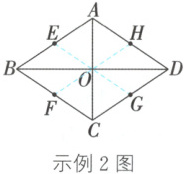 解:点 $ E $,$ F $,$ G $,$ H $ 在同一个圆上。理由:如图,连接 $ OE $,$ OF $,$ OG $,$ OH $。$ \because $ 四边形 $ ABCD $ 是菱形,$ \therefore AB = BC = CD = DA $,$ AC \perp BD $。又 $ \because E $ 为 $ AB $ 的中点,$ \therefore OE = \frac{1}{2}AB $。同理可得 $ OF = \frac{1}{2}BC $,$ OG = \frac{1}{2}CD $,$ OH = \frac{1}{2}AD $,$ \therefore OE = OF = OG = OH $。$ \therefore $ 点 $ E $,$ F $,$ G $,$ H $ 在以点 $ O $ 为圆心,$ OE $ 长为半径的圆上。