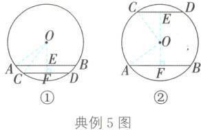 ②当弦$AB$和$CD$在圆心异侧时,如图②,连接$AO$,$CO$,过点$O$作$OF \perp AB$于点$F$,延长$FO$交$CD$于点$E$,则易得$OE \perp CD$。