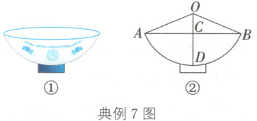 典例 7(2023·陕西)陕西饮食文化源远流长,“老碗面”是陕西地方特色美食之一。如图②所示为从正面看到的一个“老碗”(如图①)的形状示意图。$\overset{\frown}{AB}$是$\odot O$的一部分,$D$是$\overset{\frown}{AB}$的中点,连接$OD$,与弦$AB$交于点$C$,连接$OA$,$OB$。已知$AB = 24\ cm$,碗深$CD = 8\ cm$,则$\odot O$的半径$OA$为(