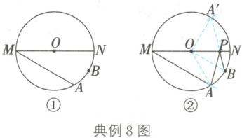 典例 8 如图①,$MN$是$\odot O$的直径,$MN = 4$,点$A$在$\odot O$上,$\angle AMN = 30^{\circ}$,$B$为$\overset{\frown}{AN}$的中点,$P$是直径$MN$上一动点。