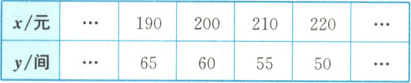 将点$(200,60)$,$(220,50)$代入,得$\begin{cases}200k + b = 60\\220k + b = 50\end{cases}$,解得$\begin{cases}k = -\frac{1}{2}\\b = 160\end{cases}$。
