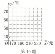 调查发现,该宾馆每间标准房的价格在 $ 170 \sim 240 $ 元之间(含 $ 170 $ 元、$ 240 $ 元)浮动时,每天入住的房间数量 $ y $(间)与每间标准房的价格 $ x $(元)的部分数据如下表:(1)根据所给数据在如图所示的平面直角坐标系中描出相应的点,并画出图象。