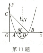 11. 如图,二次函数 $ y = x^{2} + bx + c $ 的图象与 $ x $ 轴交于点 $ A(1, 0) $ 和点 $ B $,与 $ y $ 轴交于点 $ C(0, 3) $,抛物线的对称轴与 $ x $ 轴交于点 $ D $。