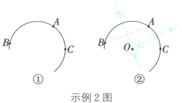 示例2 如图①,要把残破的圆形图片补画完整,已知弧上的三点$A$,$B$,$C$,试确定$\overset{\frown}{BC}$所在圆的圆心.