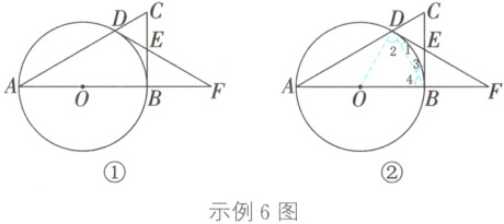 示例6 如图①,$D$是以$AB$为直径的$\odot O$上一点,过点$B$作$\odot O$的切线,交$AD$的延长线于点$C$,$E$是$BC$的中点,连接$DE$并延长,与$AB$的延长线交于点$F$.