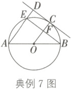 典例 7 如图,$AB$ 为 $\odot O$ 的直径,$C$ 为 $\odot O$ 上一点,$AD$ 和过点 $C$ 的 $\odot O$ 的切线互相垂直,垂足为 $D$,且交 $\odot O$ 于点 $E$。连接 $OC$,$BE$,相交于点 $F$。