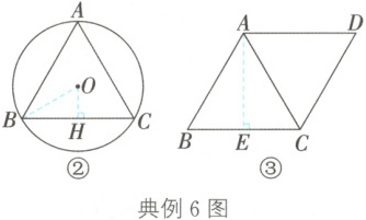 典例6 如图①,某公园有一个边长为 $4m$ 的正三角形花坛,三角形的顶点 $A$,$B$,$C$ 处各有一棵古树,现拟把原来的花坛改建成一个圆形或平行四边形花坛,且使原来的三棵古树(不能移动)位于圆周上或平行四边形的顶点上。