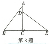 8. 如图,在 $ Rt \triangle ABC $ 中,$ \angle ACB = 90^{\circ} $,$ \triangle EDC $ 是由 $ \triangle ABC $ 绕点 $ C $ 按顺时针方向旋转得到的,且 $ B $,$ C $,$ E $ 三点在同一条直线上。