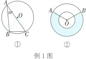 例 1 (1)如图①,$ \odot O $ 是 $ \triangle ABC $ 的外接圆,$ BC = 2 $,$ \angle BAC = 30^{\circ} $,则 $ \overset{\frown}{BC} $ 的长为 (
