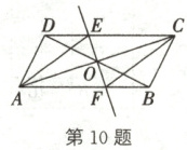 10. 如图,点$O$是$□ ABCD$的对称中心,将直线$DB$绕点$O$按顺时针方向旋转,分别交$DC$,$AB$于点$E$,$F$。
