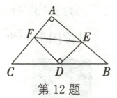 12. 如图,在$\triangle ABC$中,$\angle A = 90^{\circ}$,$D$为$BC$的中点,$DE\perp DF$,$DE$交$AB$于点$E$,$DF$交$AC$于点$F$。试探索$BE$,$EF$,$FC$之间的数量关系,并证明你的结论。