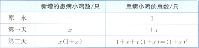 示例2 某养鸡场突发疫情,1只带病毒的小鸡经过两天的传染后使该养鸡场共169只小鸡患病. 在每一天的传染中,平均1只小鸡传染了多少只小鸡?