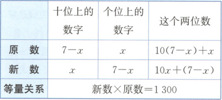 典例 2 有一个两位数,十位上的数字与个位上的数字之和为 7. 现将十位上的数字与个位上的数字对调,所得的新数与原数的积为 1300. 求这个两位数.