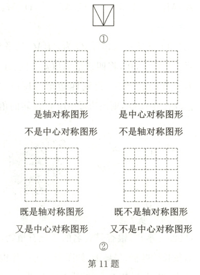11. (2023·广安)如图①,将边长为2的正方形剪成四个全等的直角三角形,用这四个直角三角形拼成符合要求的四边形,请在如图②所示的网格中画出你拼成的四边形(注:①网格中每个小正方形的边长均为1;②所拼的图形不得与原图形相同;③四边形的各顶点都在格点上).