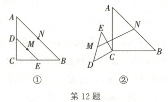 12. (2023·自贡)如图①,一大一小两个等腰直角三角形叠放在一起,M,N分别是斜边DE,AB的中点,DE=2,AB=4.