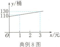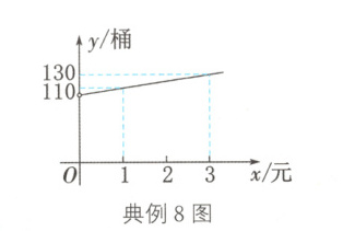 典例 8 某药店新进一批桶装消毒液,每桶进价 35 元,原计划以每桶 55 元的价格销售,现开展降价促销活动. 已知这种消毒液的销售量 $ y $(桶)与每桶降价 $ x(0 < x < 20) $(元)之间满足一次函数关系,其部分图象如图所示.