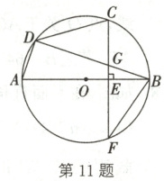11. 如图,$AB$ 是 $\odot O$ 的直径,$C$ 是 $\overset{\frown}{BD}$ 的中点,$CF$ 是 $\odot O$ 的弦,且 $CF \perp AB$,垂足为 $E$,连接 $BD$ 交 $CF$ 于点 $G$,连接 $CD$,$AD$,$BF$。