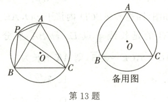 13. 如图,$\odot O$ 的半径为 $1$,$A$,$P$,$B$,$C$ 是 $\odot O$ 上的四个点,$\angle APC = \angle BPC = 60^{\circ}$。