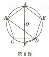 8. 如图,五边形 ABCDE 是$\odot O$的内接正五边形,AF 是$\odot O$的直径,则$\angle BDF$的度数是