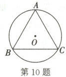 10. 如图,正三角形 ABC 的外接圆半径为 R。求正三角形 ABC 的边长、边心距、周长和面积。
