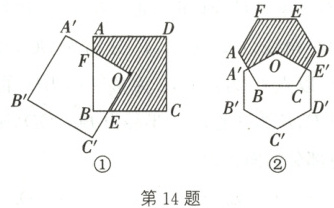 14. 如图①②所示分别为两个相同的正方形、正六边形,其中一个正多边形的顶点在另一个正多边形外接圆的圆心 O 处。求: