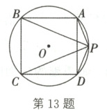 13. 如图,$\odot O$是边长为 1 的正方形 ABCD 的外接圆,P 是$\widehat{AD}$上的不同于点 A,D 的任意一点,则$PA^{2} + PB^{2} + PC^{2} + PD^{2}$的值为