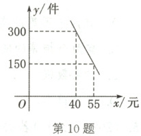 10. 某网店专门销售某种品牌的工艺品,成本为30元/件,每天的销售量y(件)与销售单价x(元)之间存在如图所示的一次函数关系。