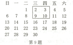 9. 如图所示为一张月历,在此月历上可以用一个矩形任意圈出2×2个位置相邻的数(如2,3,9,10)。若圈出的4个数中最大数与最小数的积为128,则这4个数中最小的数是