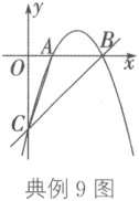 典例 9 如图,抛物线 $ y = -x^2 + bx + c $ 与 $ x $ 轴的两个交点分别为 $ A(x_1,0) $,$ B(x_2,0) $,且 $ x_1 + x_2 = 4 $,$ \frac{x_1}{x_2} = \frac{1}{3} $。