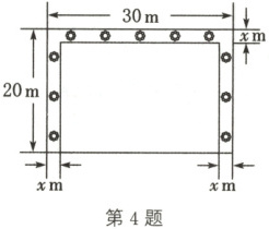 4. 学校计划在一块长$30m$、宽$20m$的矩形空地上划出四分之一的区域种花,小红同学的设计方案如图所示,求花带的宽度。设花带的宽度为$x m$,则可列方程为