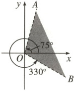 如题图,$330°$角的终边与$-30°$角的终边相同,$-30°=-\frac {\pi}{6}$,而$75°=75×\frac {\pi}{180}=\frac {5\pi}{12}$,故终边落在阴影部分内(不包括边界)的角的集合为$\{\theta\mid 2k\pi-\frac {\pi}{6}<\theta<2k\pi+\frac {5\pi}{12},k\in\mathbf{Z}\}$.